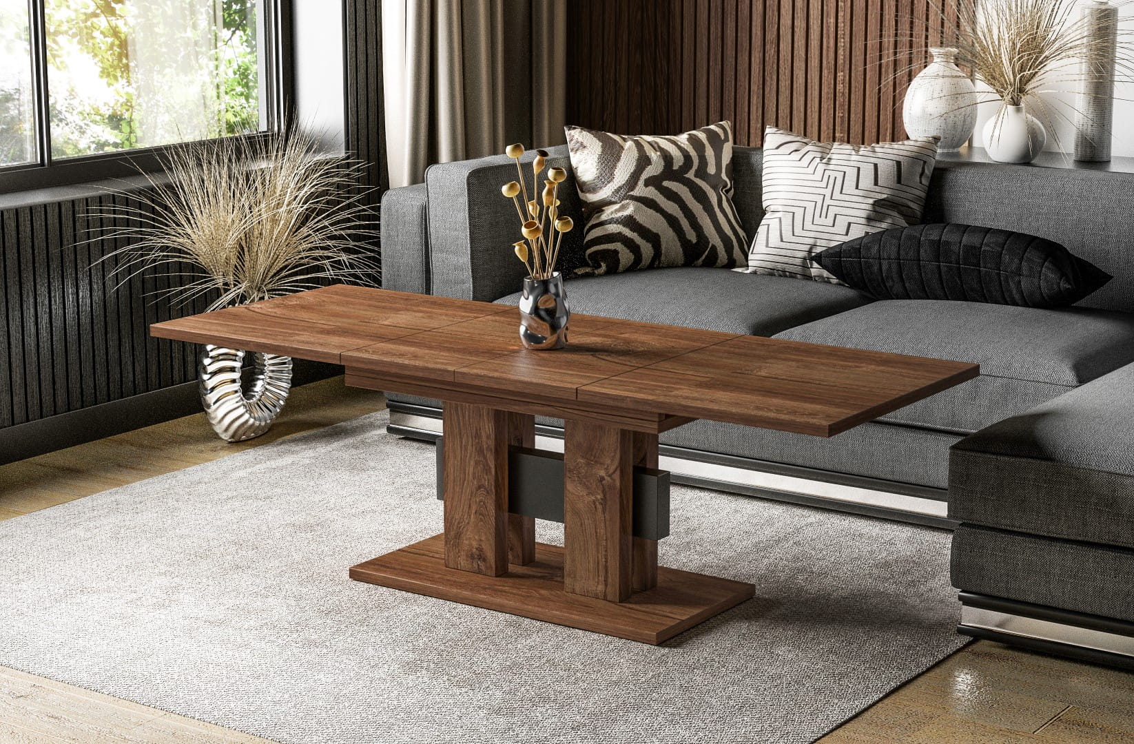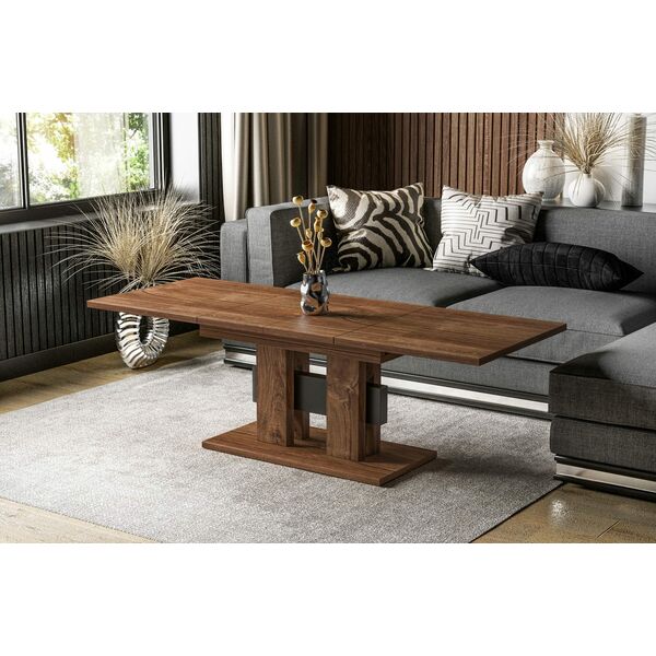 Ława Nero to stylowa i oryginalna propozycja nowoczesnej, rozkładanej ławy do pokoju dziennego. Dzięki wkładkom chowanym pod blatem ławę można szybko złożyć i rozłożyć na wypadek niezaplanowanej wizyty gości. Zastosowanie dwóch wkładek umożliwia wydłuż