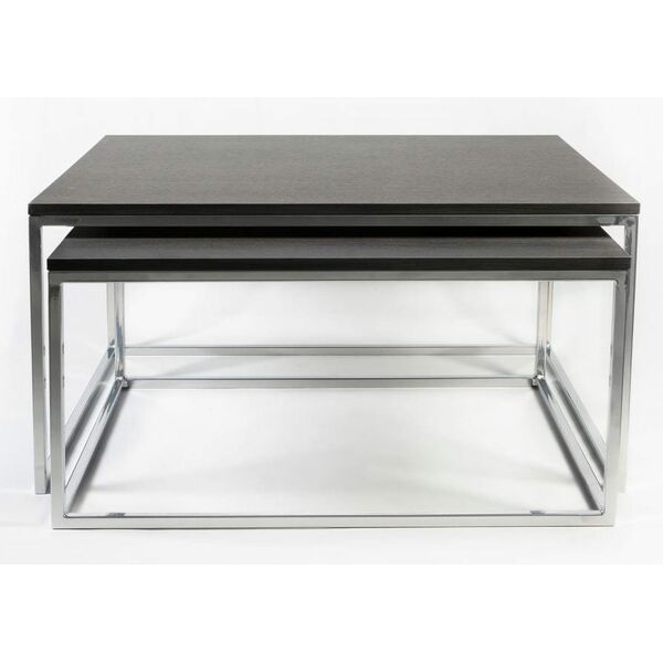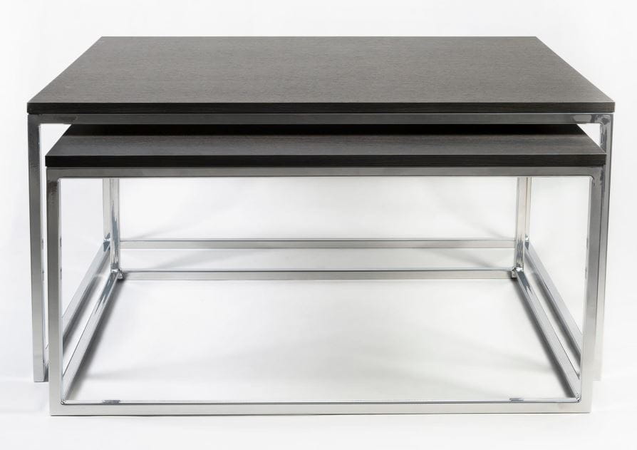 Zestaw stolików Glamour powstał z połączenia solidnego blatu oraz ręcznie spawanej metalowej podstawy w formie przestrzennej bryły imitującej chrom. Różne opcje kolorystyczne bla